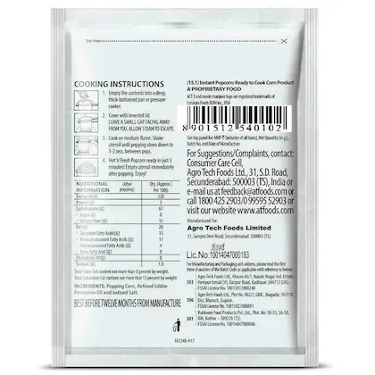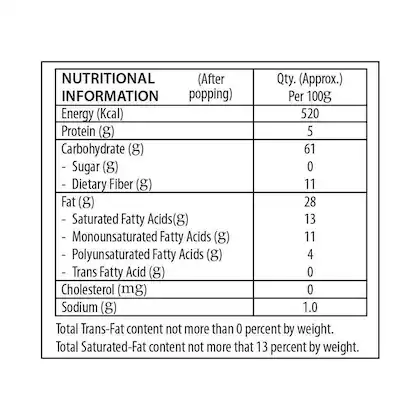 INGREDIENTS:- Popping corn, Edible vegetable oil, iodised salt, anti-Oxidant,Acidity Regulator, Emulsifier