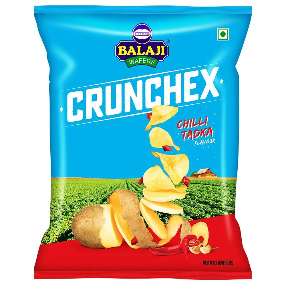 Spice up your snacking game with Balaji Crunchex Chilli Tadka Potato Wafers the ultimate blend of bold spices and crispy potato goodness. A spicy twist on classic potato wafers. Handpicked spices infused in every crisp. Perfect snack for movie nights or parties.
