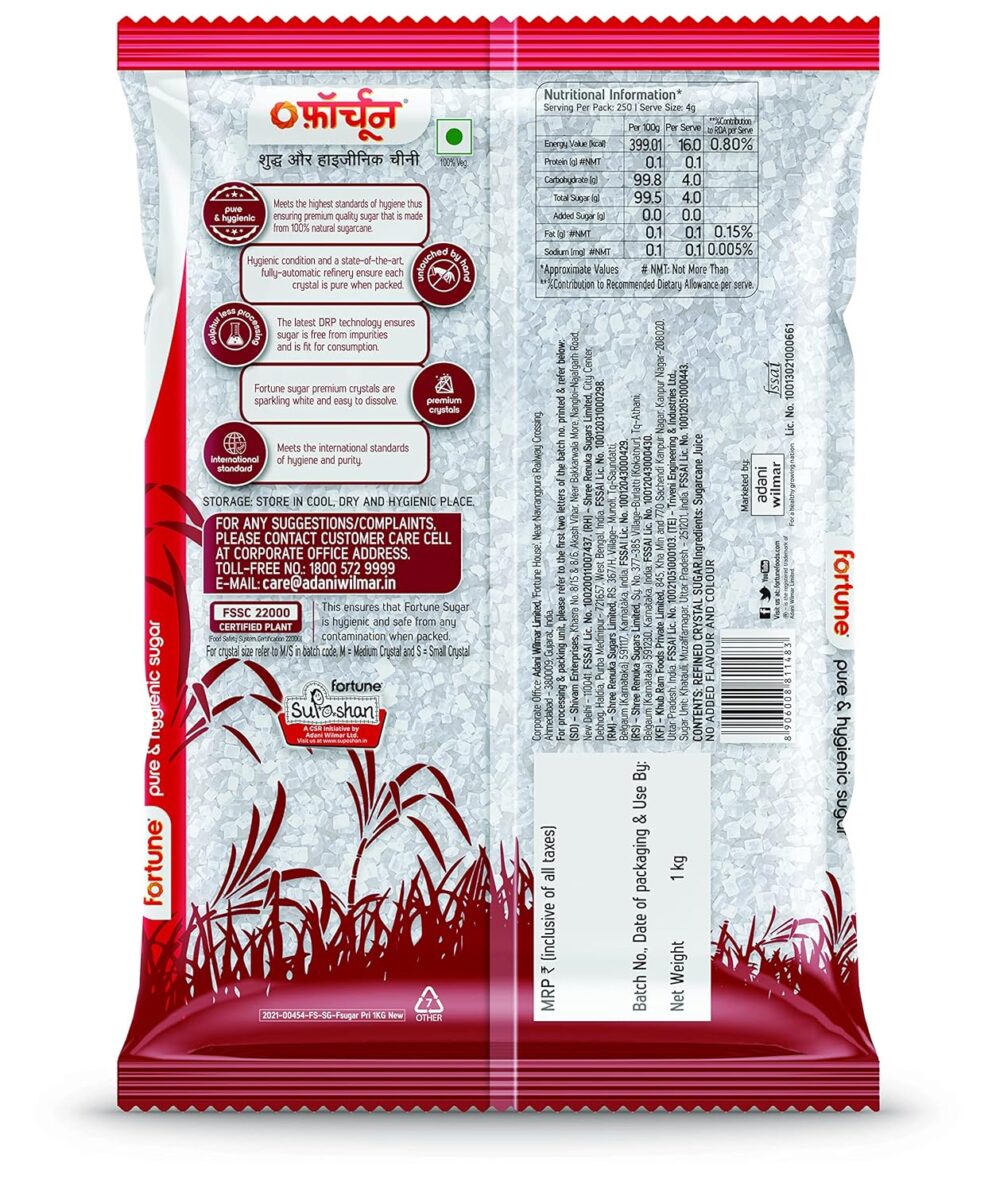 फॉर्च्यून फाइन ग्रेन शुगर को हाथ से नहीं छुआ जाता है और इसे सल्फर रहित प्रक्रिया का उपयोग करके बनाया जाता है। चीनी प्रीमियम गुणवत्ता की है और क्रिस्टल चमकदार सफेद हैं और घुलने में आसान हैं। इसे स्वच्छता और शुद्धता के सभी अंतरराष्ट्रीय मानकों को ध्यान में रखते हुए संसाधित किया जाता है। यह 100% गन्ने की चीनी से बना है।