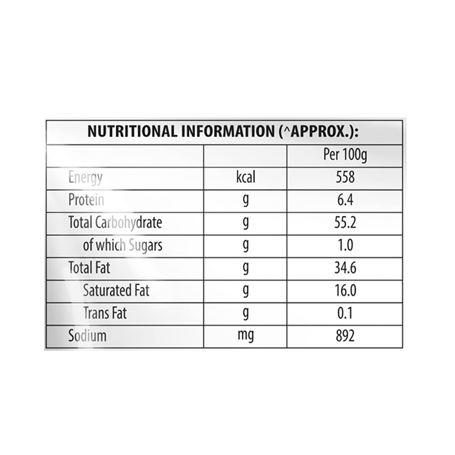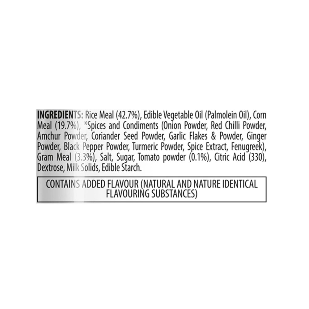 INGREDIENTS:- rice meal, edible vegetable oil, corn meal, spices and condiments (onion powder, chilli powder, coriander powder, ginger powder, garlic powder, black pepper powder, turmeric powder, fenugreek powder), salt, black salt, tomato powder, sugar and tartaric acid.