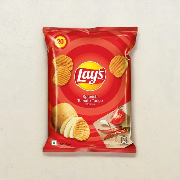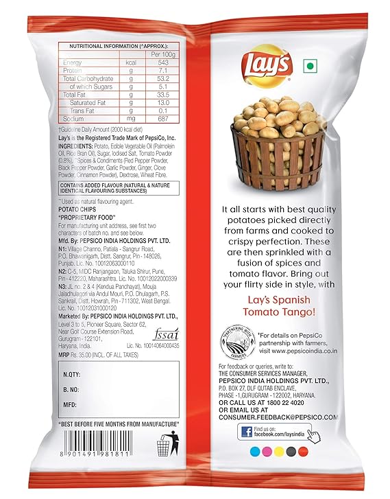 INGREDIENTS:- Potato, Edible Vegetable Oil, Sugar, Salt, Tomato Powder (1.1%),**Spices & Condiments (Capsicum powder, Garlic Powder, Pepper Powder, Ginger powder, Clove powder, Cinnamon powder), Wheat Fibre, Dextrose, Citric Acid, Tartaric Acid.
