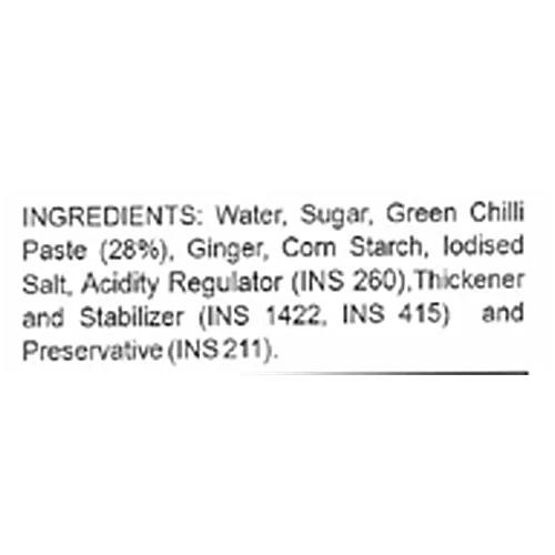 INGREDIENTS:- Water, Green Chilli, Salt, Modified Maize Starch, Sugar, Acetic Acid (Acidifying Agent), Garlic Powder, Xanthan Gum (Stabilizing Agent), Sodium Benzoate (Added as Preservative). Cumin Powder, Coriander Powder.