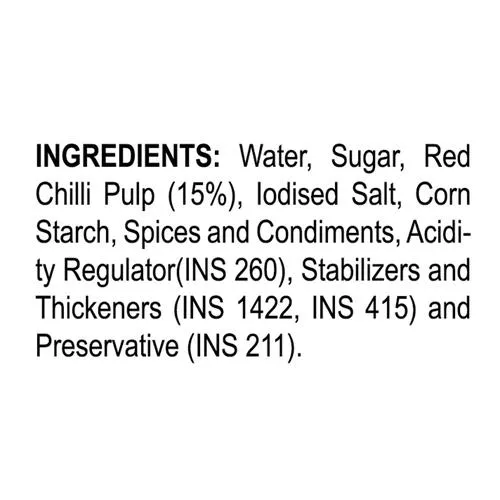 INGREDIENTS:- Water, Red Chilli Paste (32%) , Sugar, Garlic, Ginger, Edible Common Salt, Acidity Regulators (INS 260, INS 330), Thickeners [INS 1422 (0.4%), INS 415] and Preservative (INS 211).