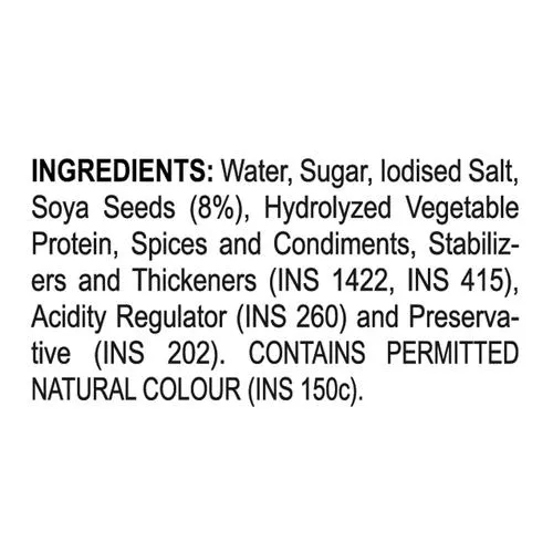 INGREDIENTS:- Water, Salt, Caramel, Hydrolyzed Soy Protein, Corn Syrup, Glucose Solids, Sodium Benzoate, Dimethylpolysiloxane (antifoaming Agent).
