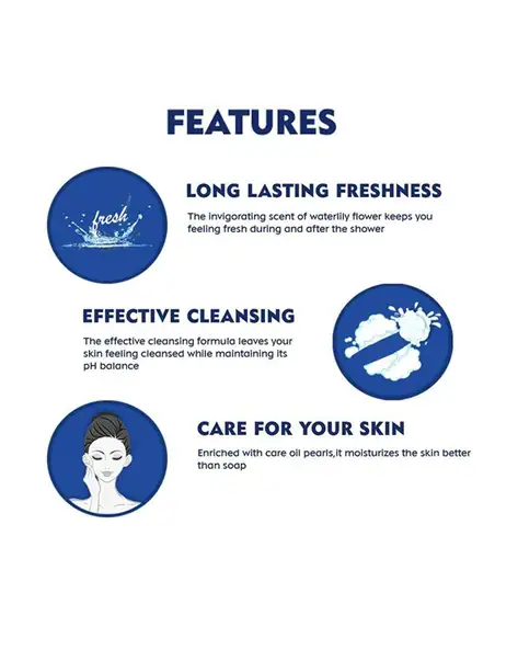 is enriched with care oil pearls that moisturize your skin. It refreshes your skin and makes it soft and supple. As the fresh shower gel envelops your skin with a silky soft foam, its invigorating scent of waterlily will stimulates your senses.