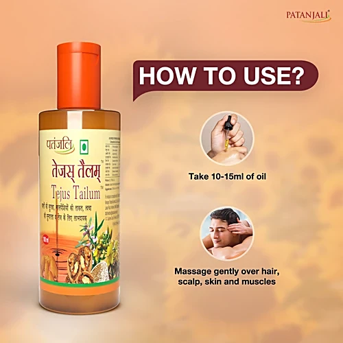 INGREDIENTS:- 75 * Inclusive of All Taxes. Patanjali Tejus Tailum oil is an exceptional ayurvedic blend consisting of 100% pure olive oil, almond oil, walnut oil, sunflower oil, sesame oil, soybean oil, mustard oil, and castor oils.