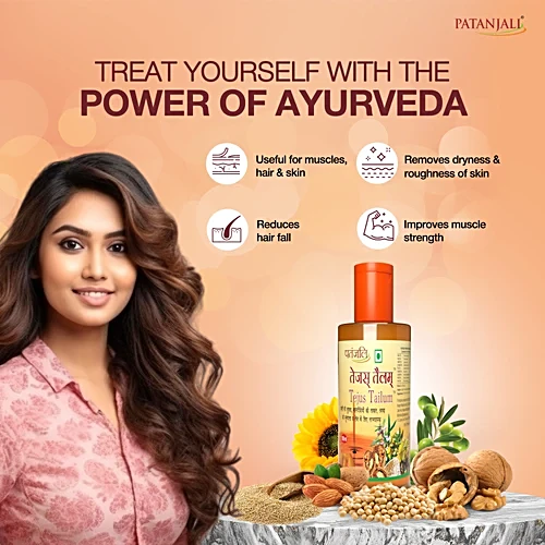 Patanjali Tejus Tailum is a herbal oil blend designed for nourishing skin and hair, with a focus on muscle strength and vitality. It’s a blend of 100% pure oils, including olive oil, almond oil, walnut oil, sunflower oil, sesame oil, soybean oil, mustard oil, and castor oil. The oil is valued for its ability to deeply penetrate the skin, muscles, scalp, and hair shafts, providing nourishment and strength.