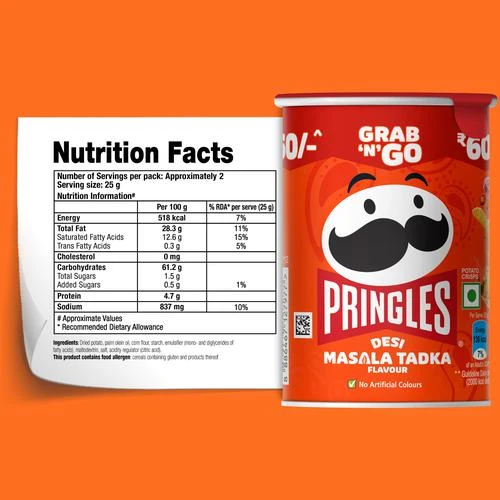 INGREDIENTS:- Dried Potato(45%), Edible Vegetable Oil(Palm Oil), Corn Flour, Wheat Starch, Desi Masala Tadka Falvour Seasoning(5.5%)[Salt, Maltodextrin, Vegetable Powders{Onion Powder(6%), Garlic Powder(2.7%), Tomato Powder(1%)}, Sugar, Spices{Black Pepper Powder(4%), Ginger Powder(1%), Turmeric Powder(1%)}, Acidity Regulators(INS …